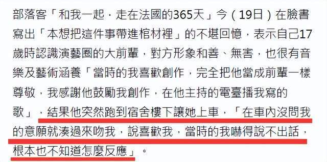 然而令她万万没想到的是,这位男星某天夜里出现在她宿舍,并在车内未经过她的同意就强吻她,还说喜欢她,让她恐吓到无法说话,也不知道该如何反应。