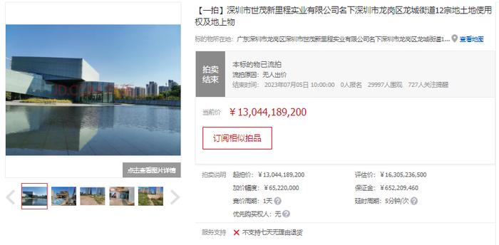 7月5日10时,随着倒计时停止跳动,深圳市世茂新里程实业有限公司(下称“深圳世茂新里程”)名下位于深圳市龙岗区龙城街道的12宗地土地使用权及地上物因无人出价而流拍。