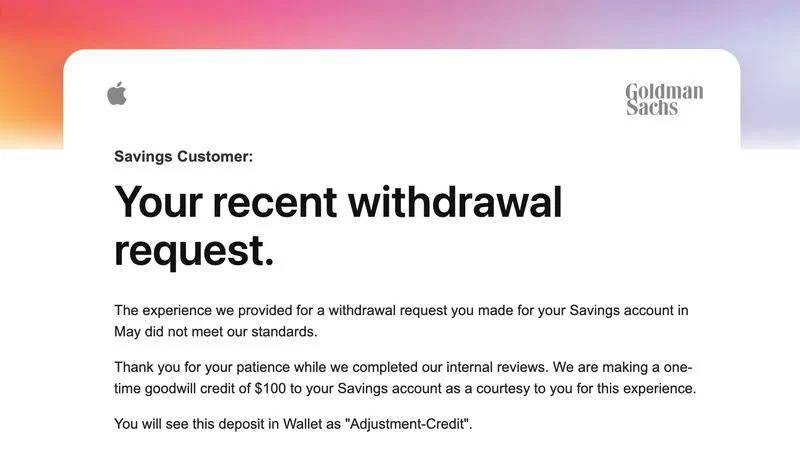 苹果在电子邮件中表示,部分 Apple Savings 用户此前在提现过程中,遇到了提现严重超期的情况,导致用户体验不佳。