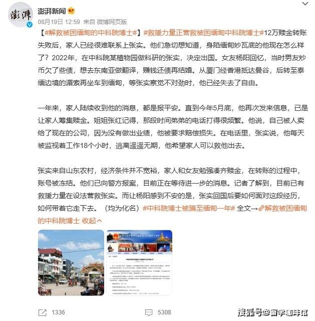 近日,一网友发文称其博士朋友张先生 2022 年 8 月 16 日被骗至缅甸至今已一年,每日被强迫工作 18 小时,同时被严密监控。