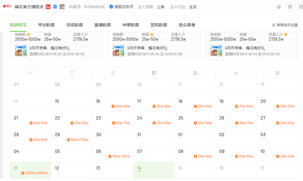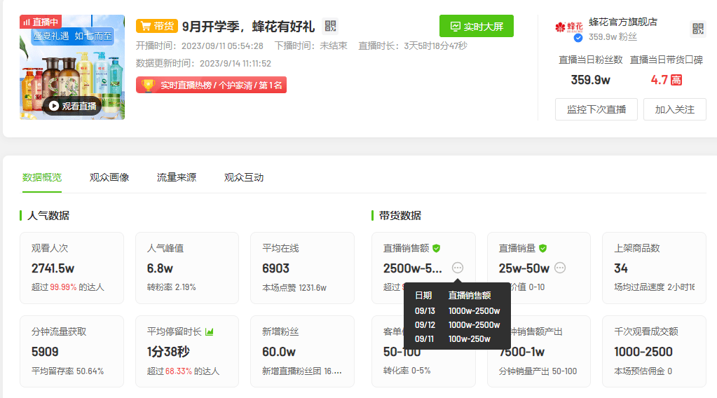 品牌直播间也迎来了销量、销售额的翻倍增长。据飞瓜数据,蜂花9月11日开播的直播间,目前销售额已超2500万元,销量也超过了25万单。此前,蜂花直播间的销售额很少超过百万。