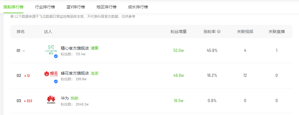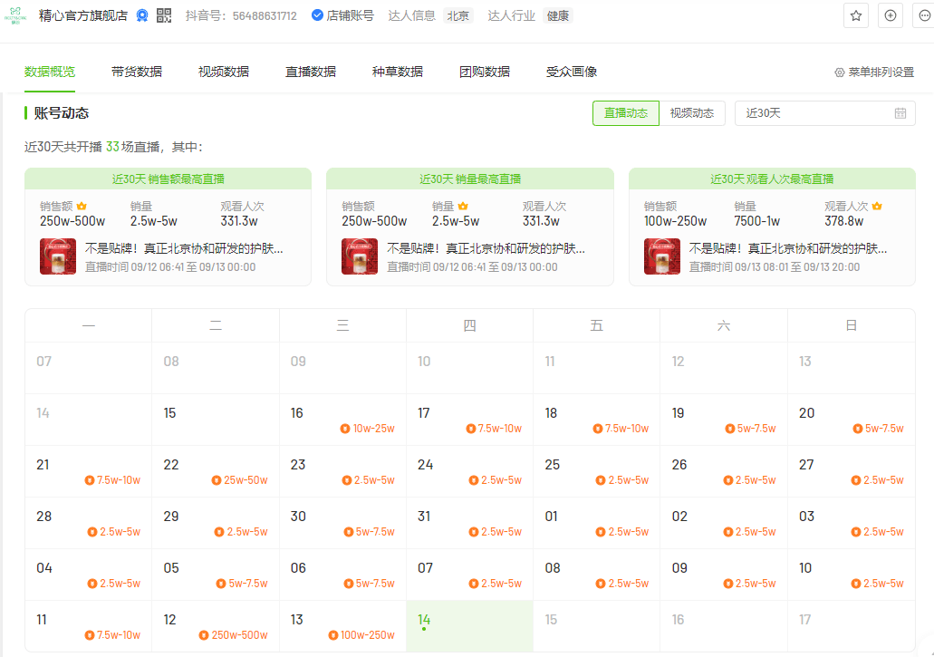 据飞瓜数据,精心官方旗舰店9月13日涨粉量甚至高于蜂花、华为,日增长量达52万。而其直播间销售额也在12日达到了250万至500万,超11日的25倍。
