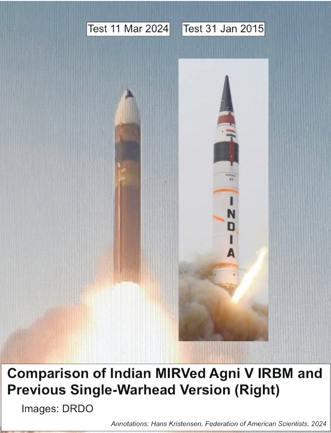 美国科学家联合会网站12日称,DRDO发布的“烈火5”最新发射照片显示,它与早期试射的同型导弹相比,外形已出现重大改变。尤其是弹头部分的整流罩从原来的尖形变成了钝头形,与美俄等国的洲际导弹外形相似。克里斯滕森认为,相关改进可能与该导弹采用了MIRV技术有关。