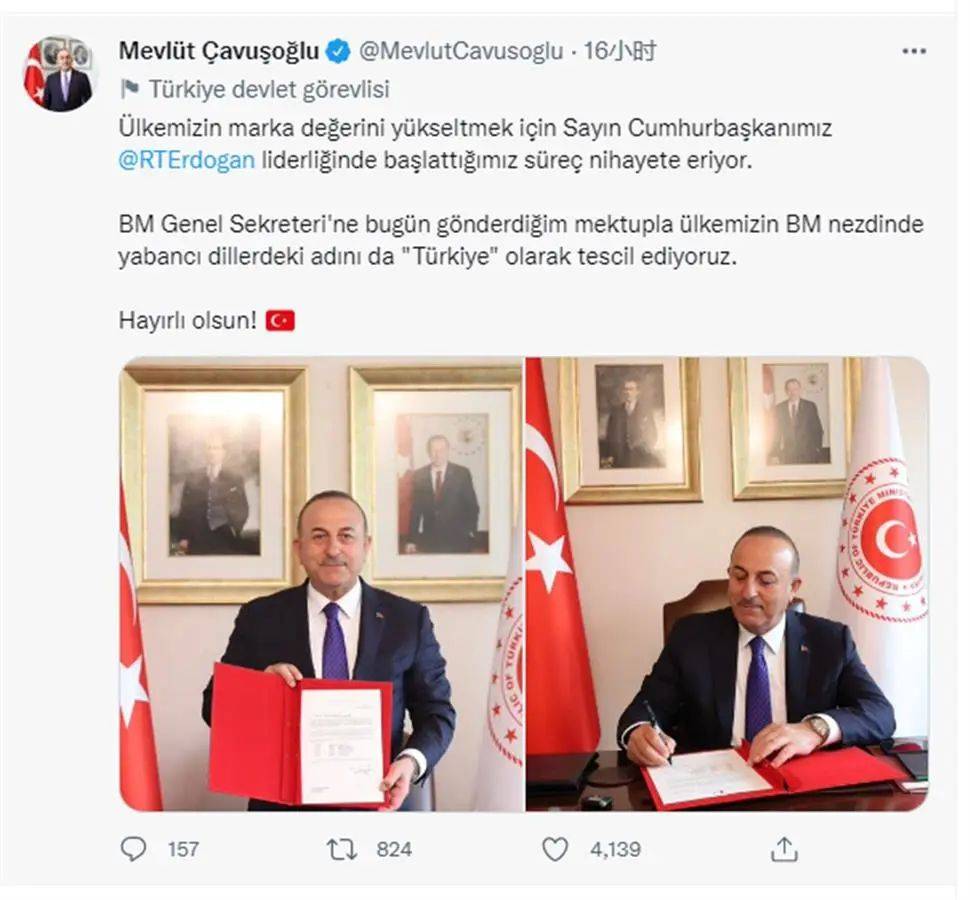 恰武什奥卢在推特上说:“在总统埃尔多安的领导下,土耳其为提高土耳其品牌价值而发起的进程已经有了结果。我今天向联合国秘书长递交了信函,在联合国将我们国家的外文名称注册为‘Türkiye’。”