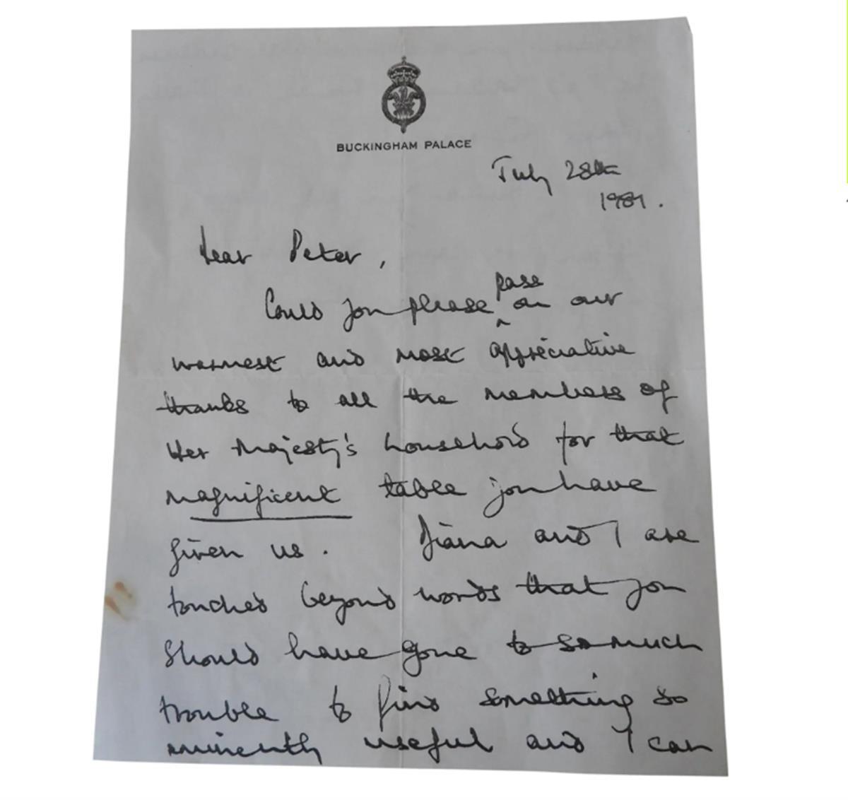 查尔斯写了一封感谢信,寄给他们中的一员皮特作为感谢。信中写道:“戴安娜和我感动得无以复加,你们费尽心思找到了这么有用的东西,我向你们保证,无论它最后被安置在哪个房子里,我们都会把它珍藏起来!”