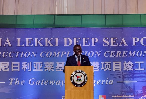 10月31日,在尼日利亚拉各斯,拉各斯州州长巴巴吉德·桑沃-奥卢在中企承建的尼日利亚莱基深水港竣工仪式上致辞。