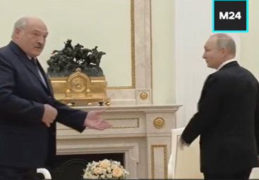 (卢卡申科一边一只手指向普京,一边对现场俄方工作人员说话的画面。图源:“莫斯科24”电视台视频截图)