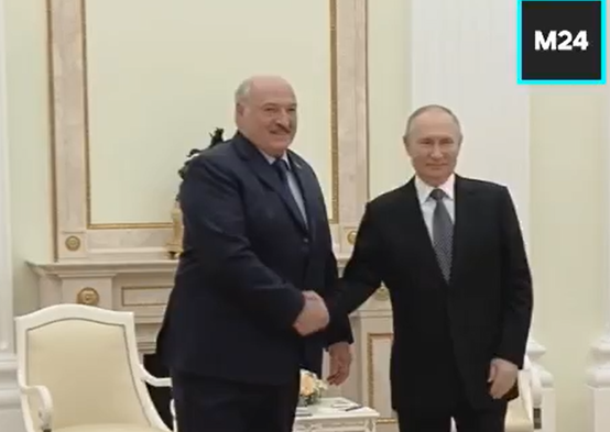 (普京当地时间4月5日与卢卡申科会见时握手的画面。图源:“莫斯科24”电视台视频截图)