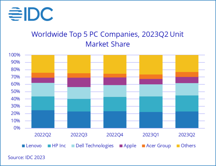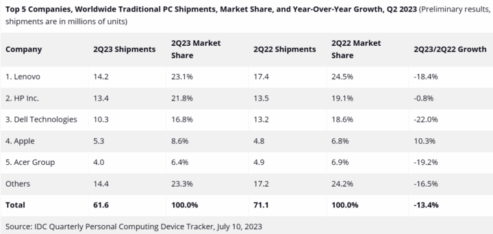 根据IDC全球季度个人计算设备跟踪报告的初步结果,2023年第二季度全球PC出货量同比下降13.4%。这是由于宏观经济逆风、消费者和商业部门需求疲软以及IT预算从设备购买转向而导致的连续第六个季度收缩。尽管表现不佳,但本季度市场表现好于预期。