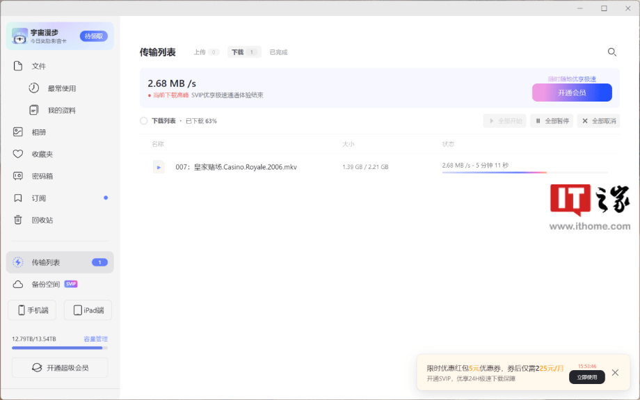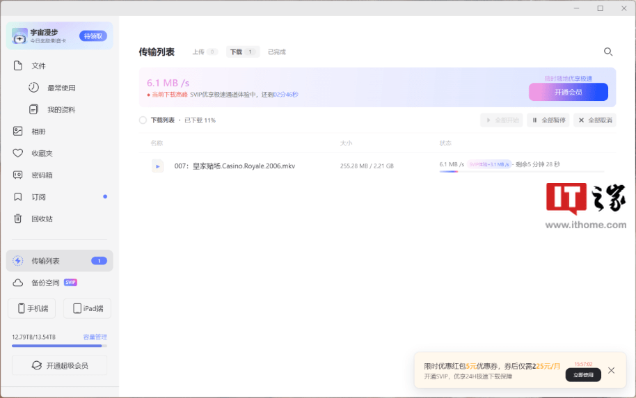 IT之家 7 月 18 日消息,近日有IT之家用户投稿,称阿里云盘客户端近期开始出现下载限速现象,需要开通会员才能提速。