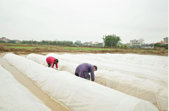 惊蛰过后,气温出现短时下降,林芳、江广升两口子赶紧来到田间给早稻秧苗搭盖农膜。