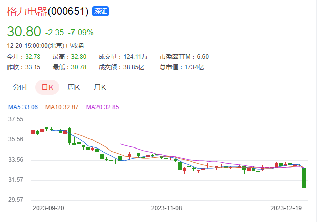 此消息一出,12月20日开盘,格力电器股价暴跌7.09%,一天市值蒸发超130亿。
