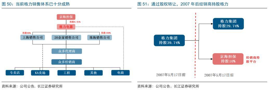 这之后,格力大股东拿出10%的股份,让十大省份的经销商入股,同时引入中小经销商,平衡区域性销售公司的矛盾,形成了一套交叉持股、共同进退的渠道联盟。