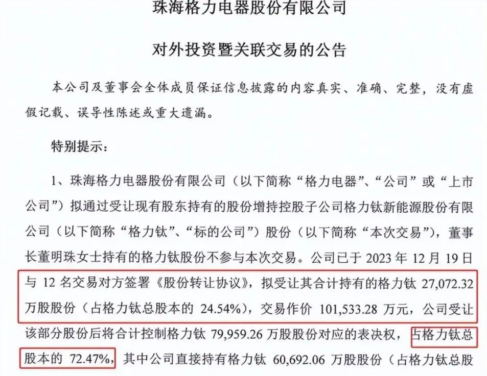 12月19日晚间,格力电器在公告里宣布,拟通过受让12名交易对方合计持有的格力钛新能源股份有限公司(下称“格力钛”)约2.71亿股股份(占格力钛总股本的24.54%)的方式增持格力钛,交易作价约10.15亿元。交易后,格力电器在格力钛的持股比例将会增至55.01%。加上董明珠个人持有的17.46%股份的表决权 ,格力电器在格力钛的表决权将增至72.47%。
