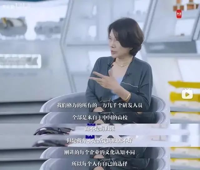 早在 2021年5月30日,董明珠就曾在全国青年企业家峰会上强调过,格力不会采用海归派研发人员。在《南风窗》的采访中,董明珠对此给出的解释是:“不是否定海归派,是一种企业的文化认知,每个人有自己的选择。”