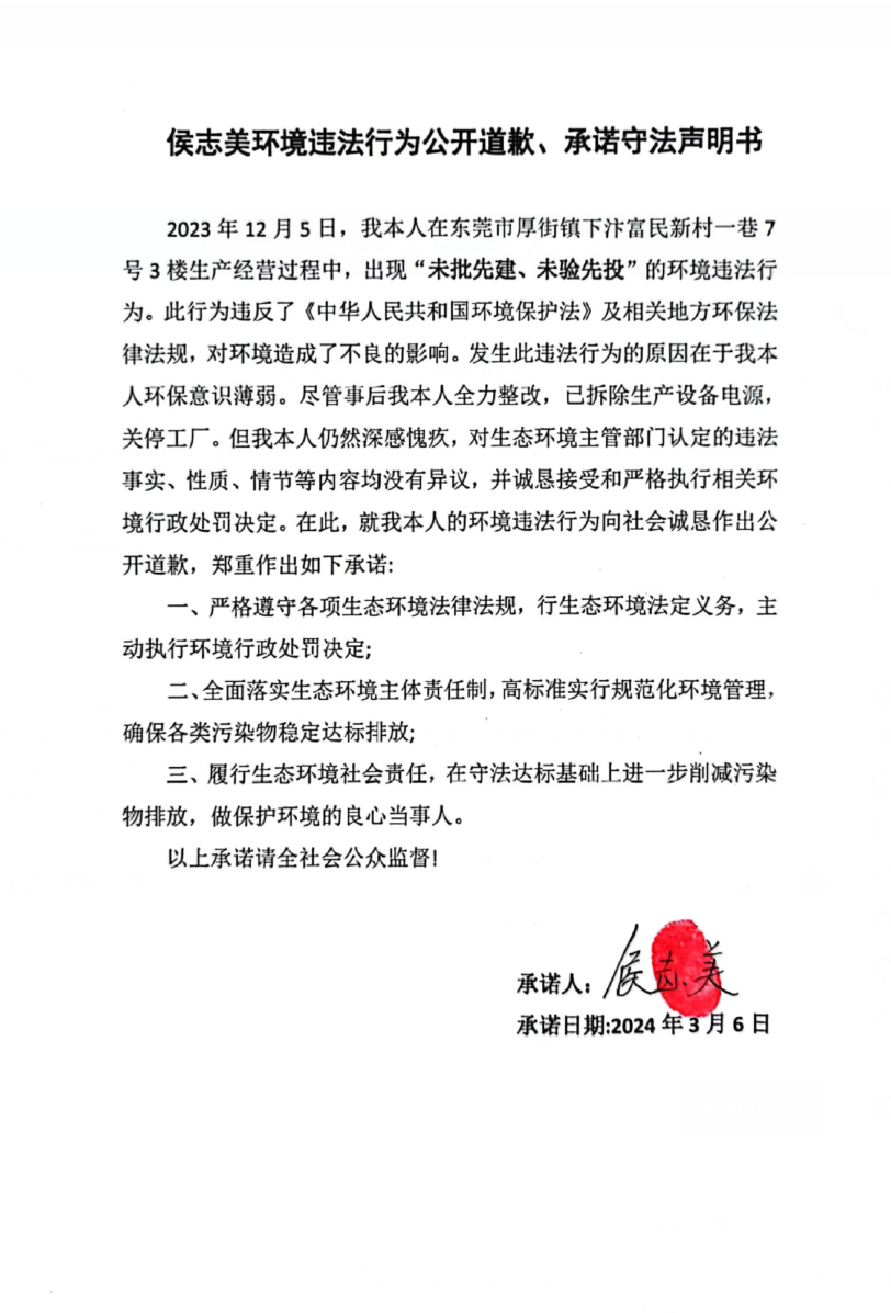 侯志美环境违法行为公开道歉、承诺守法声明书