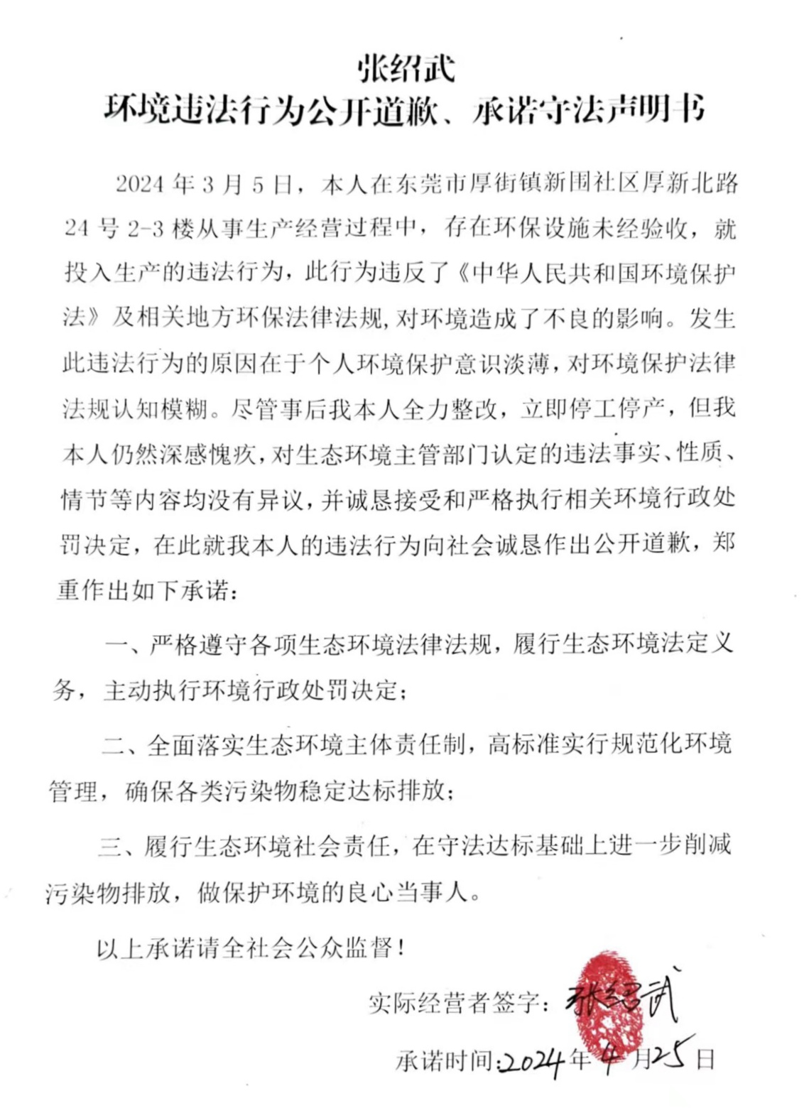 张绍武环境违法行为公开道歉、承诺守法声明书