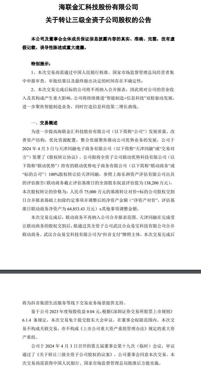 IT之家此前报道,海联金汇于6月17日发布公告,拟将旗下的支付机构(联动优势电子商务有限公司),转让给抖音支付牌照主体(武汉合众易宝科技有限公司)的母公司,交易价格为基准转让对价7.5亿元+交割日净资产。收购完成后,抖音支付补齐银行卡收单业务许可。