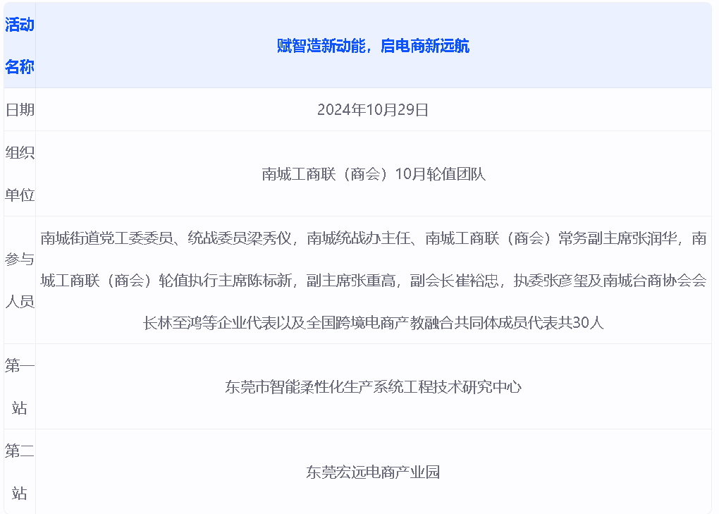 南城街道党工委委员、统战委员梁秀仪表示,此次活动有助于南城民营企业家拓宽视野,把握跨境电商和智能制造的发展趋势,为企业转型升级提供了新的思路。