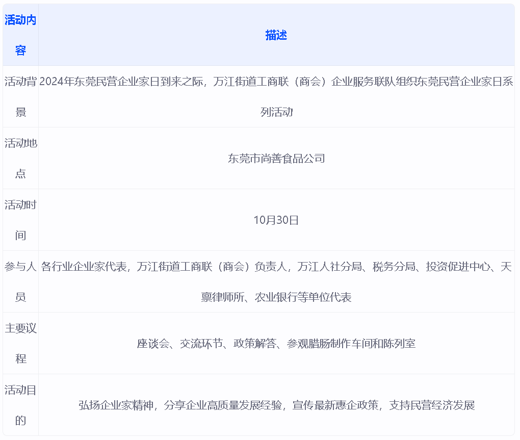 在2024年东莞民营企业家日到来之际,万江街道工商联(商会)企业服务联队组织开展了东莞民营企业家日系列活动,以进一步弘扬企业家精神。10月30日,万江街道工商联(商会)企业服务联队第13站活动在东莞市尚善食品公司举行,各行业企业家代表会聚一堂,为东莞民营企业家日“热身”。