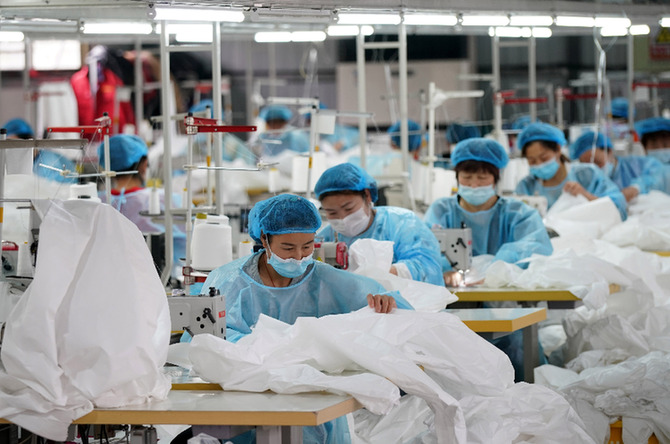 5月11日,河北超越服装有限公司工人在生产隔离服。 连日来,河北省邢台市疫情防控物资生产企业开足马力,加紧生产隔离服、防疫药品、口罩等,助力疫情防控。(来源: 经济参考报)