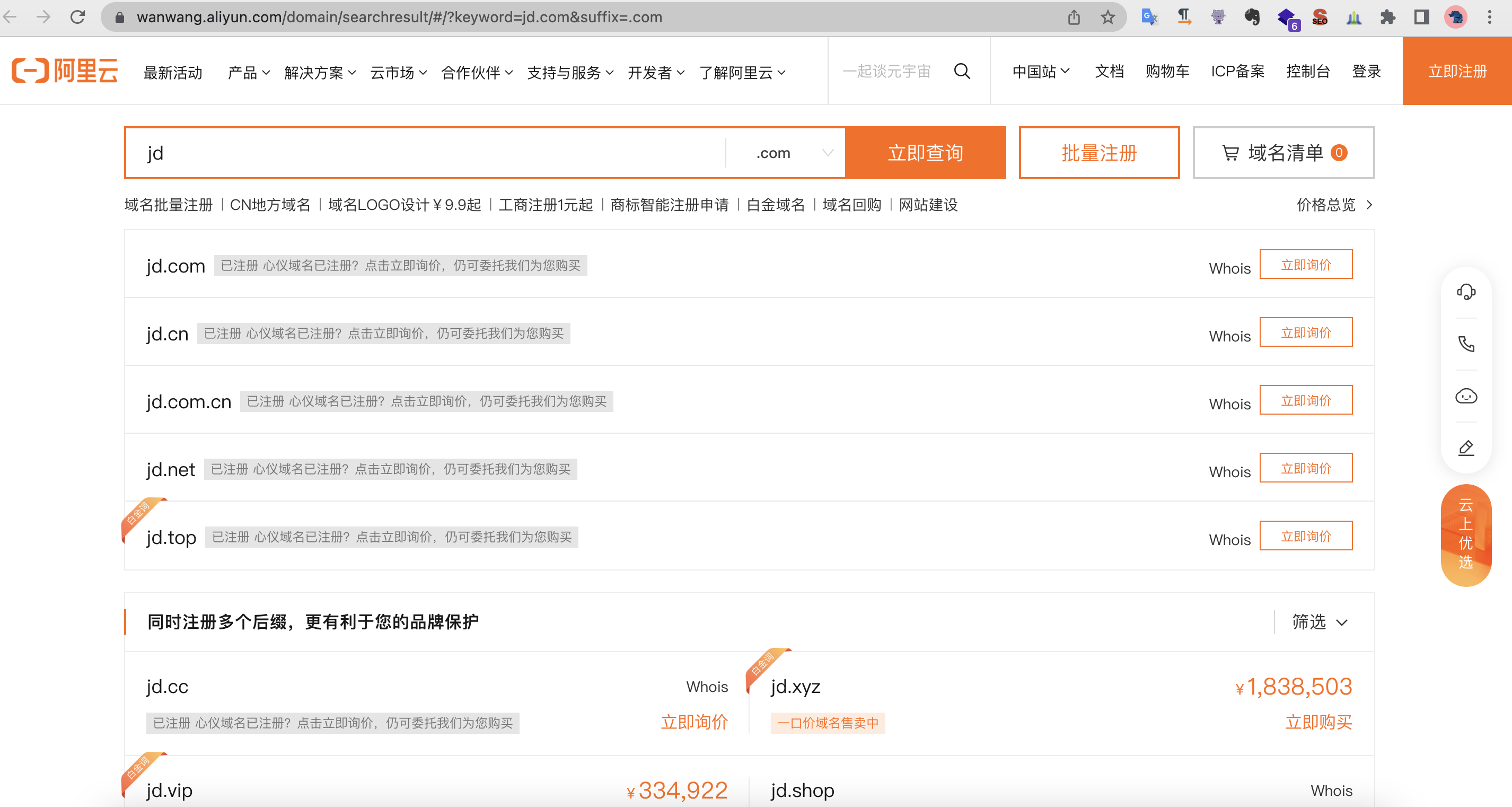 1、想好几个公司的域名,然后到阿里云去查询是否已经被注册,如果还没有被注册,可以注册阿里云账号后进行注册操作。