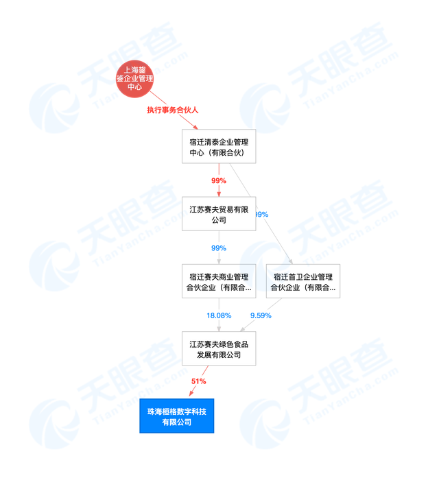 珠海桓格仅有两个股东,大股东江苏赛夫绿色食品发展有限公司,持股51%;另一家持有剩余49%股份的股东珠海桓格贸易有限公司。天眼查显示,其疑似实控人为上海鋆鉴企业管理中心(出资人为童炜)。