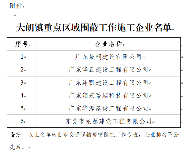 9月13日,东莞市住房和城乡建设局发布《关于表彰在“02·24涉疫事件”中作出突出贡献先进企业的通报》,通报表彰6家大朗镇重点区域围蔽工作施工企业,并奖励信用分50分。他们分别是广东晟桐建设有限公司、广东华正建设工程有限公司、广东沣凯建设工程有限公司、广东翔宏幕墙科技有限公司、广东华淳建设工程有限公司、东莞市龙源建设工程有限公司(排名不分先后)。