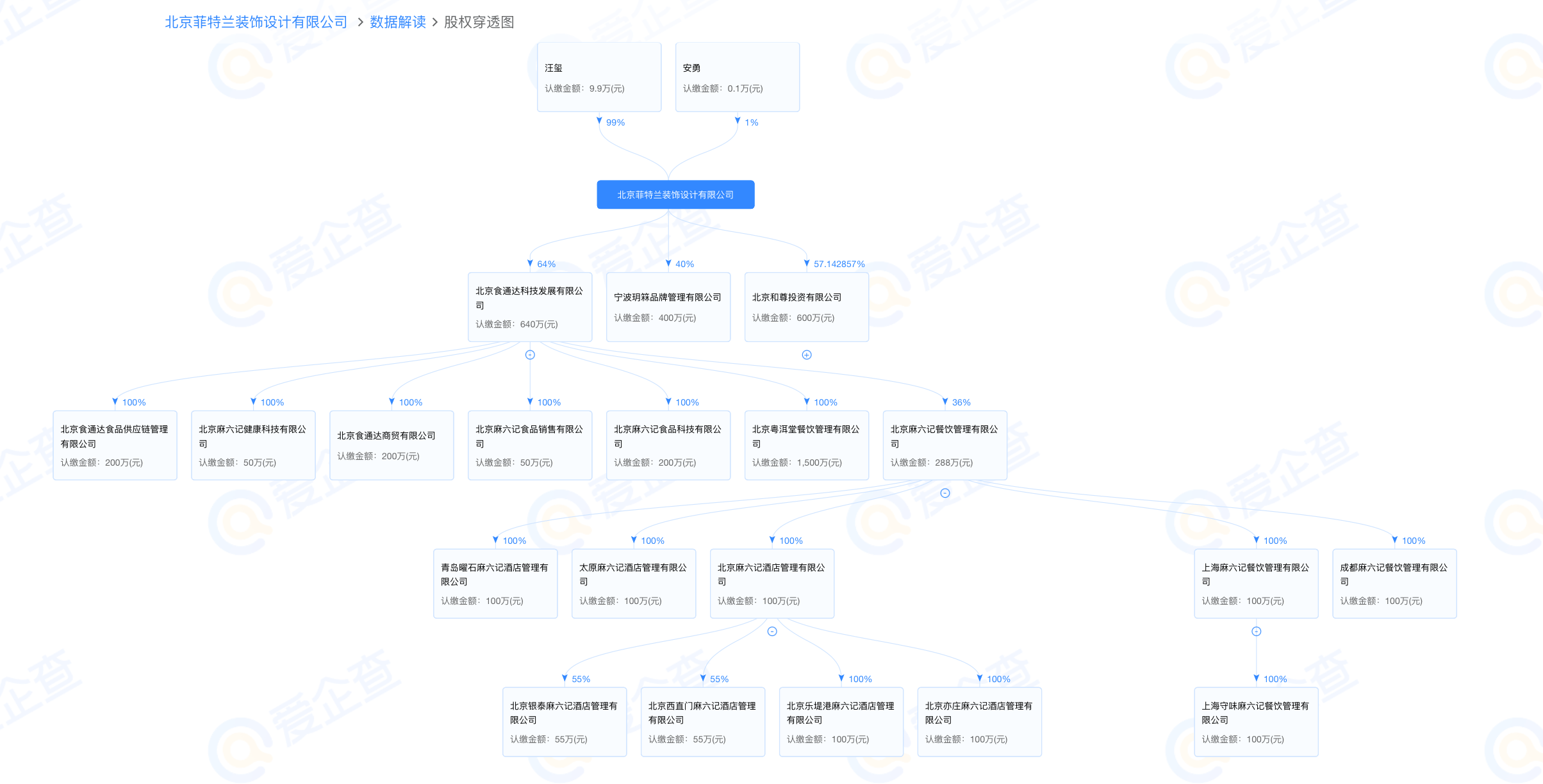 爱企查股权穿透图显示,该公司为北京食通达科技发展有限公司股东,后者控股北京麻六记健康科技有限公司、北京麻六记食品销售有限公司等多家企业,间接控股北京麻六记酒店管理有限公司、上海麻六记餐饮管理有限公司、北京银泰麻六记酒店管理有限公司等多家麻六记相关企业。