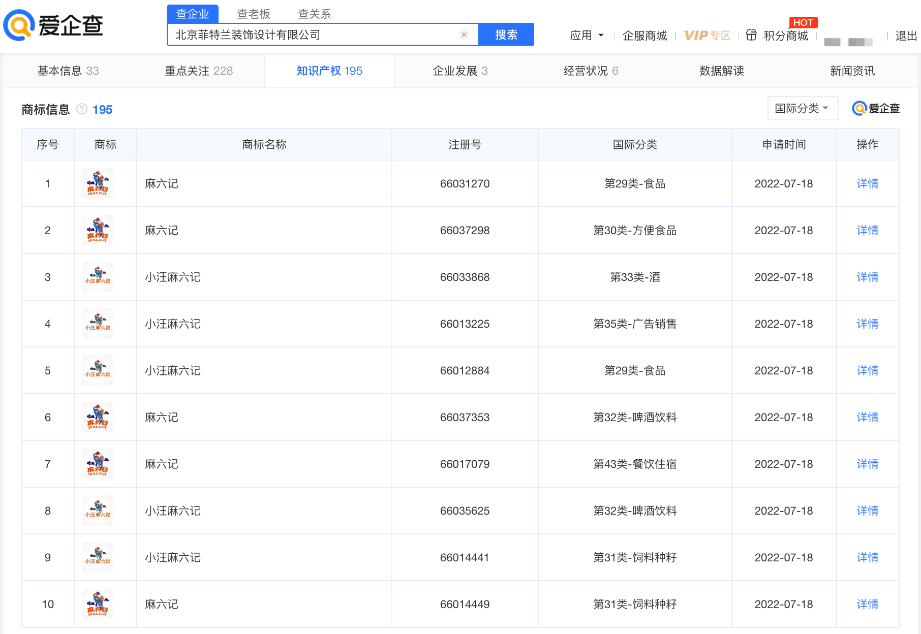 爱企查商标信息显示,该公司申请多个“麻六记”、“ 小汪麻六记”“ 麻六记居酒屋”等商标,仅2022年申请商标超百枚,国际分类涉及食品、方便食品、酒、广告销售、餐饮住宿等,目前商标状态多为注册申请中。