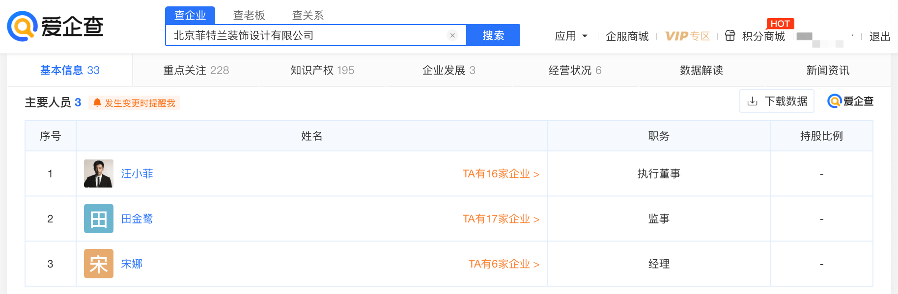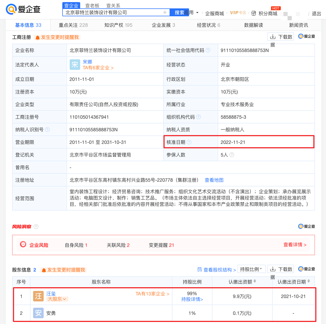 据爱企查App显示,近日汪小菲退出北京菲特兰装饰设计有限公司股东,该公司由汪玺、安勇共同持股,持股比例分别为99%、1%,#汪小菲# 仍担任该公司执行董事。#汪小菲退出麻六记关联公司股东#