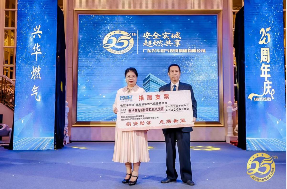 捐赠仪式在兴华燃气集团25周年庆晚会上举行,公司董事长、总经理周绮霞代表员工将善款捐赠给广东省兴华燃气慈善基金会,由基金会理事长张少保代表接受。