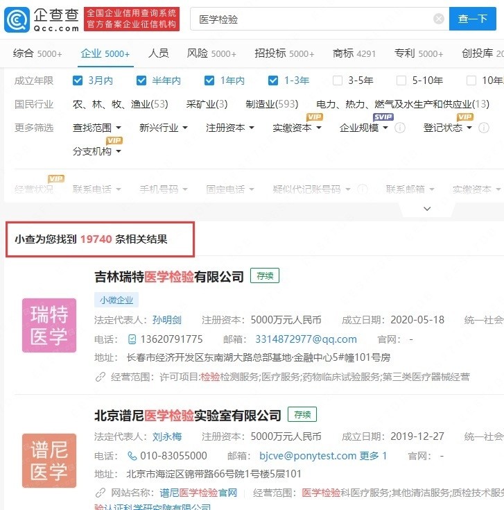 从全民核酸筛查,到如今核酸检测常态化,核酸检测企业业绩一路腾飞,企查查APP显示,近3年,新成立的医学检验公司近20000家。