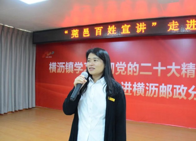 于丽艳是横沥邮政分公司总经理助理,她结合中国快递行业的变化,用生动的实例、通俗易懂的语言,宣讲党的二十大精神,让“快递小哥”坐得住、听得懂、听得进、记得牢。