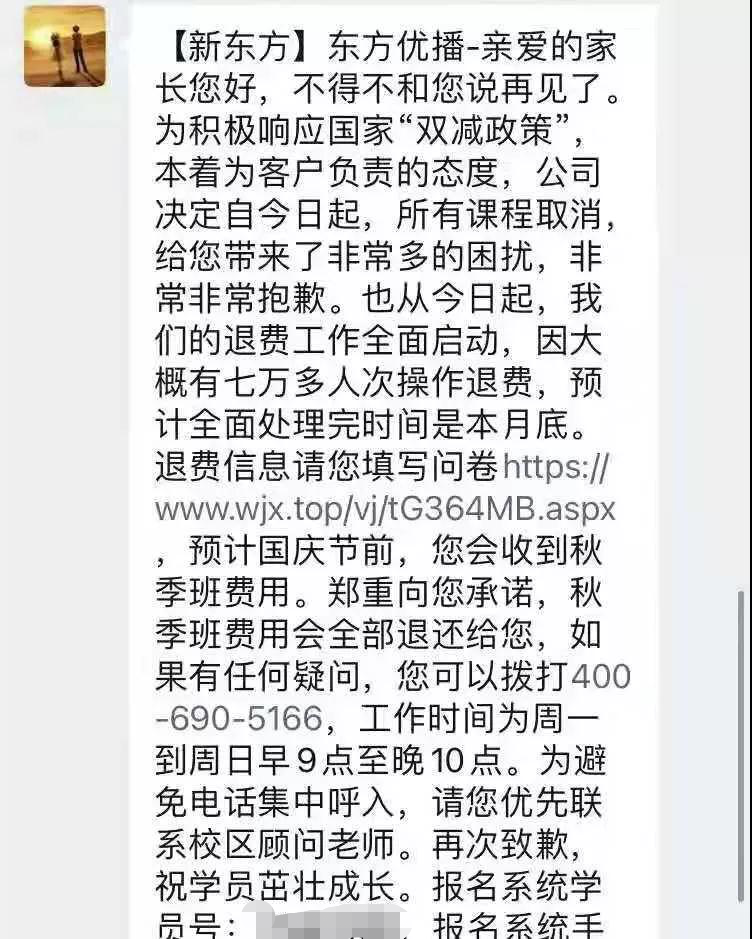 信息时报记者向新东方教育科技集团求证,对方回应,“依照国家‘双减’政策要求,新东方在线积极响应并持续调整相关业务,确保公司合规发展。东方优播已决定关闭K12阶段学科类培训业务。目前,公司账面资金较为充裕,我们将依法依规做好学员退费和员工伙伴的妥善安置及补偿。”