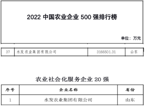 近日,“2022中国农业企业500强”正式发布,水发农业集团有限公司(以下简称“水发农业”)荣登“2022中国农业企业500强”榜单,排名第37位,较去年上升46位。同时,水发农业还入选了“农业社会化服务企业20强”榜单,排名第1位。