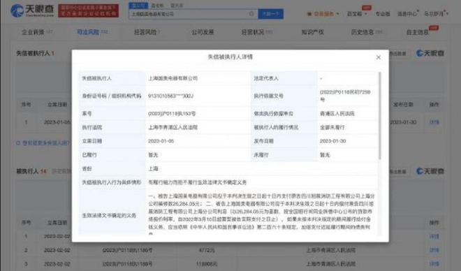 据天眼查数据显示,近日,因有履行能力而拒不履行生效法律文书确定义务,上海国美电器有限公司被列为失信被执行人(老赖),涉及案件为建设工程施工合同纠纷。此前,法院判决该公司支付原告四川旭展消防工程有限公司上海分公司装修款2.6万余元及利息。今年1月,该公司因此案被强制执行2.7万余元。