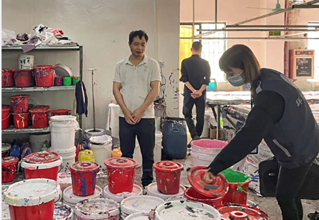 该厂主要从事布料印花加工,未办理工商营业执照,未经生态环境部门审批同意擅自开工建设,设有印花、清洗等工序和印花长台、印花板、清洗池等生产设备。该厂印花工序未配套废气污染防治设施,废气无组织排放;清洗工序产生的废水由清洗池收集后再由电动水泵抽到过滤机加入清污药粉搅拌后经软管排入厕所。执法人员对该厂有关负责人作出“双笔录”并进行立案查处,责令其限期整改。