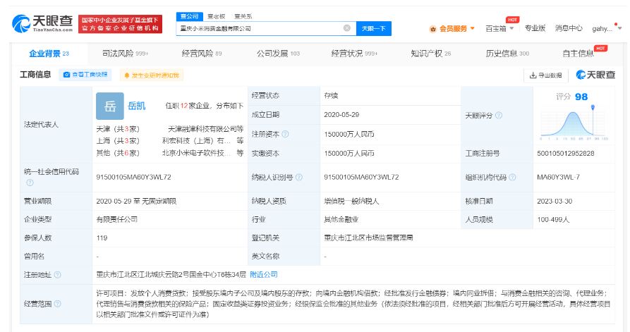 该公司成立于2020年5月,注册资本15亿人民币,经营范围含发放个人消费贷款;接受股东境内子公司及境内股东的存款;向境内金融机构借款等,由小米通讯技术有限公司、重庆农村商业银行股份有限公司等共同持股。