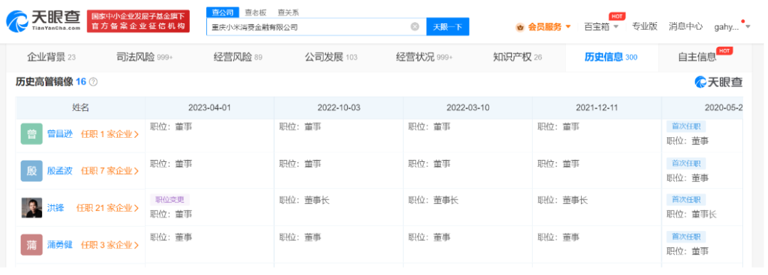据天眼查APP显示,近日,重庆小米消费金融有限公司发生工商变更,洪锋卸任该公司法定代表人、董事长,仍任董事,岳凯接任法定代表人、董事长,同时刘黎卸任董事。