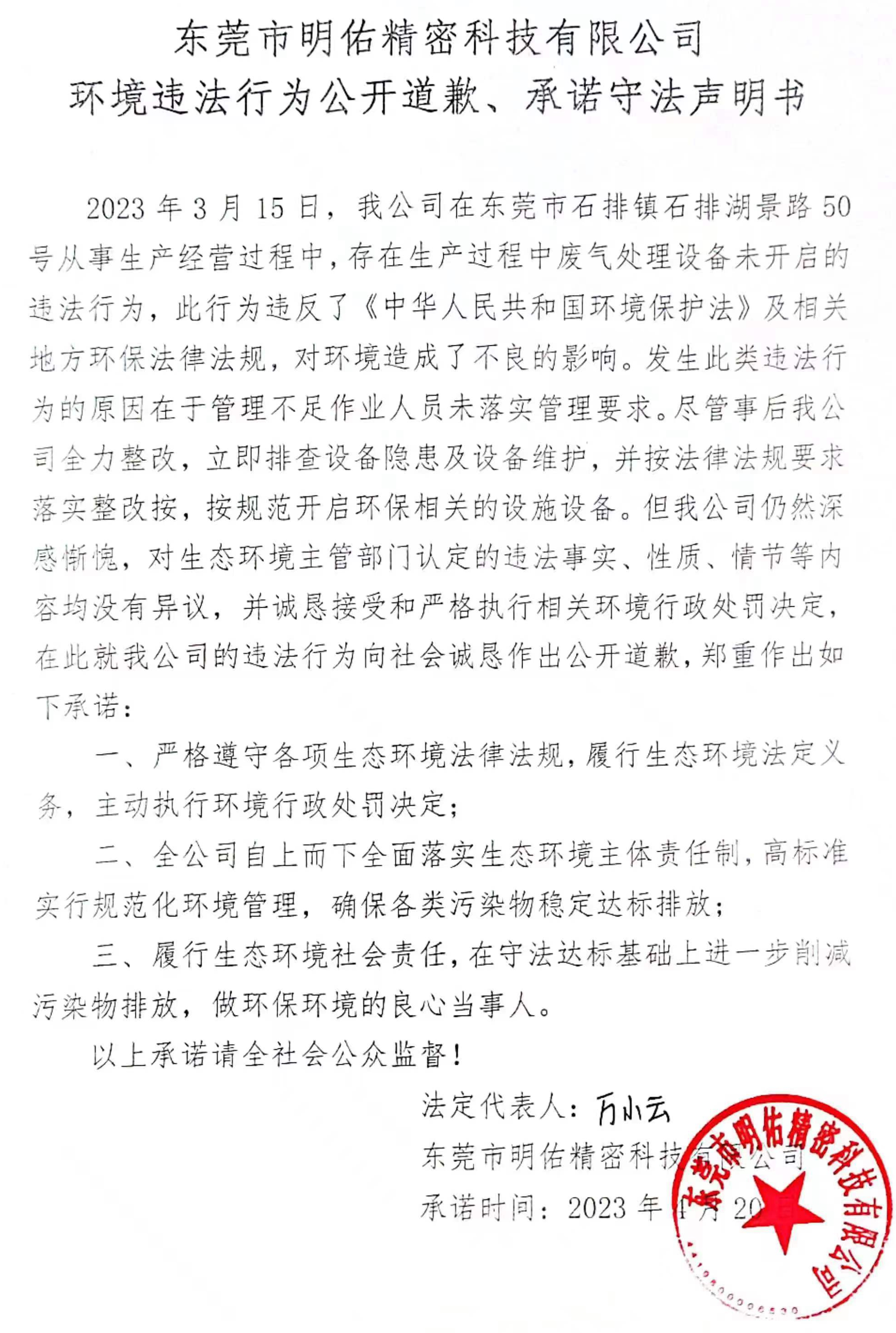 东莞市明佑精密科技有限公司环境违法行为公开道歉、承诺守法声明书