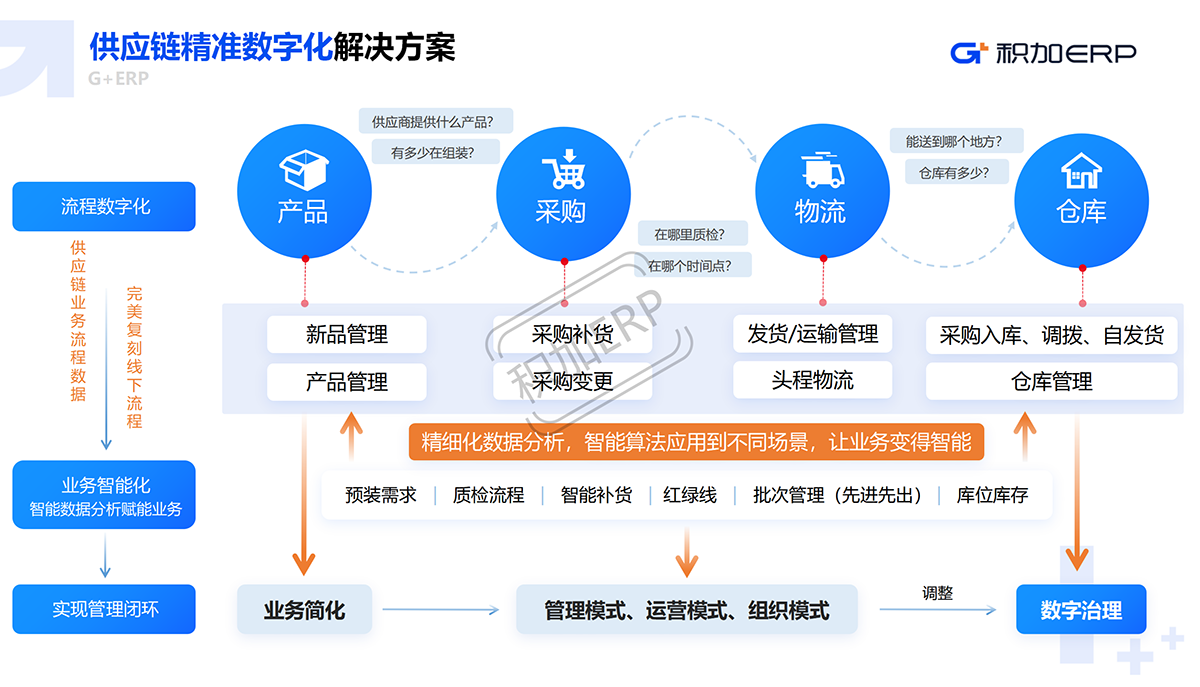积加ERP从供应链场景出发,完美复刻线下所有流程,将智能算法应用到不同场景,把供应链业务数据精准地搬到线上,围绕着信息流(物流)、数据流、资金流这三个方面,形成从计划、采购、生产、交货、质检、发货、物流全流程闭环供应链管理,使实施过程中,单据勾稽关系严谨,环环相扣;各部门权责分明,高效协同,多维度实现可视化,可控化。