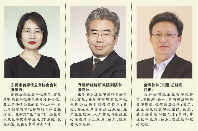 东莞拥有数字经济发展的丰富场景。自东莞去年“一号文”出台以来,东莞产业数字化和数字产业化的发展情况如何?企业数字化进程的“施工图”如何制定?本报特邀东莞市首席信息官协会会长张庆云、万博新经济研究院副院长张海冰、金蝶软件(东莞)总经理许彬三位行业人士从实战角度予以分享。