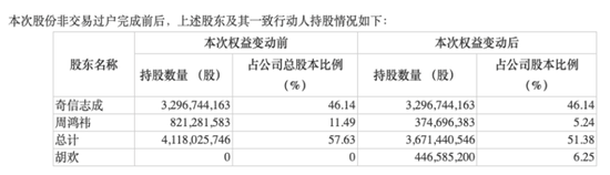 6月6日晚,三六零(601360)公告于近日收到通知,公司实际控制人周鸿祎已完成向胡欢转让其持有的公司股份共计约4.47亿股,约占公司总股份的6.25%。