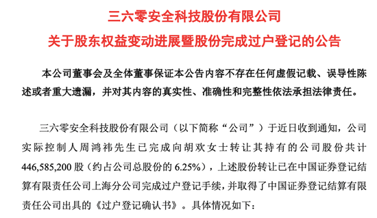 今年4月4日,三六零公告,周鸿祎与胡欢签订了《离婚协议》,协议约定周鸿祎将其直接持有的约占公司总股份的6.25%分割至胡欢名下。