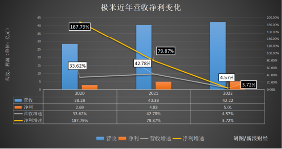 新浪科技梳理极米历年财报发现,极米营收和利润在2020年和2021年保持着高速增长,但2022年进入微增长状态。2022年,极米实现营业收入42.22亿元,同比增长4.57%;归属于上市公司股东的净利润5.01亿元,同比增长3.72%。