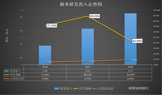 研发投入方面,极米近年来保持着两位数的同比增长,2022年研发投入为3.77亿元,同比增长43.49%,研发费用率为8.93%。