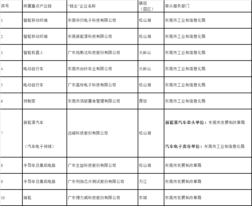 记者从东莞市工业和信息化局官方网站获悉,《东莞市第一批重点产业链“链主”企业名单》正式公布,共10家企业入选。