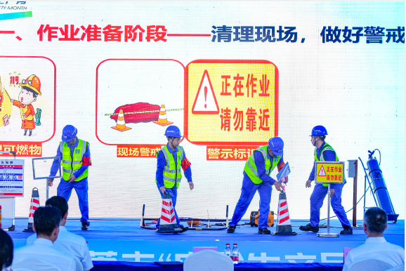 “一律不准进行交叉作业、一律清除现场可燃物质、一律检测可燃气体含量、保持良好通风……”活动现场,专业讲解和一线工人在舞台上现场进行动火作业安全演示,直观呈现整个动火作业的安全规范。