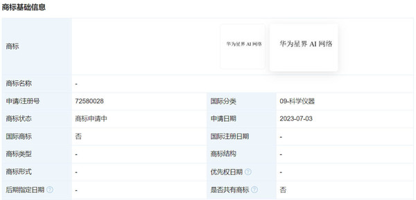 近日,CNMO注意到,根据相关App显示的信息,华为技术有限公司申请注册“华为星河AI网络”“华为星界AI网络”“华为星渊AI网络”“华为星空AI网络”商标,国际分类涉及科学仪器、网站服务,当前商标状态均为申请中。